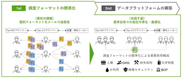 | SEMIジャパンは、半導体サプライチェーン上で流通しているサステナビリティ関連データの調査フォーマットの共通・標準化の検討を開始した。 【背景】 近年、半導体産業における環境・社会・ガバナンス(ESG)や人権関連のガイドラインの強化により、バリューチェーン全体の透明性が求められる中、個別フォーマットをメールで送受信するなど企業間でのデータのやり取りは煩雑化し、非効率な状況が続いている。こうした課題を受け、SEMIジャパンはサプライチェーン全体での高位平準化・最適化の必要性を認識し、調査フォーマットの標準化に向けた検討を開始する。 【概要】 半導体サプライチェーン上でやり取りされているサステナビリティ関連をはじめとする協調領域のデータ流通の効率化を図るとともに、将来的にはデータ登録・参照を統合するプラットフォームの構築を目指す。 ![]() 【今後の予定】 ・2026年中: 特定領域の調査にかかる共通テンプレートの運用開始 ・2027年以降: グローバル展開及びデータプラットフォームの構築・運用開始 【検討参画企業】 1. 半導体関連企業(2025年12月15日現在) アドバンテスト、荏原製作所、SCREEN-HD、ディスコ、東京エレクトロン、東京精密、ニコン、日立ハイテク、レゾナック 2. 事務局 セミ・ジャパン、三菱UFJ銀行、NTTデータ、EYストラテジー・アンド・コンサルティング |
