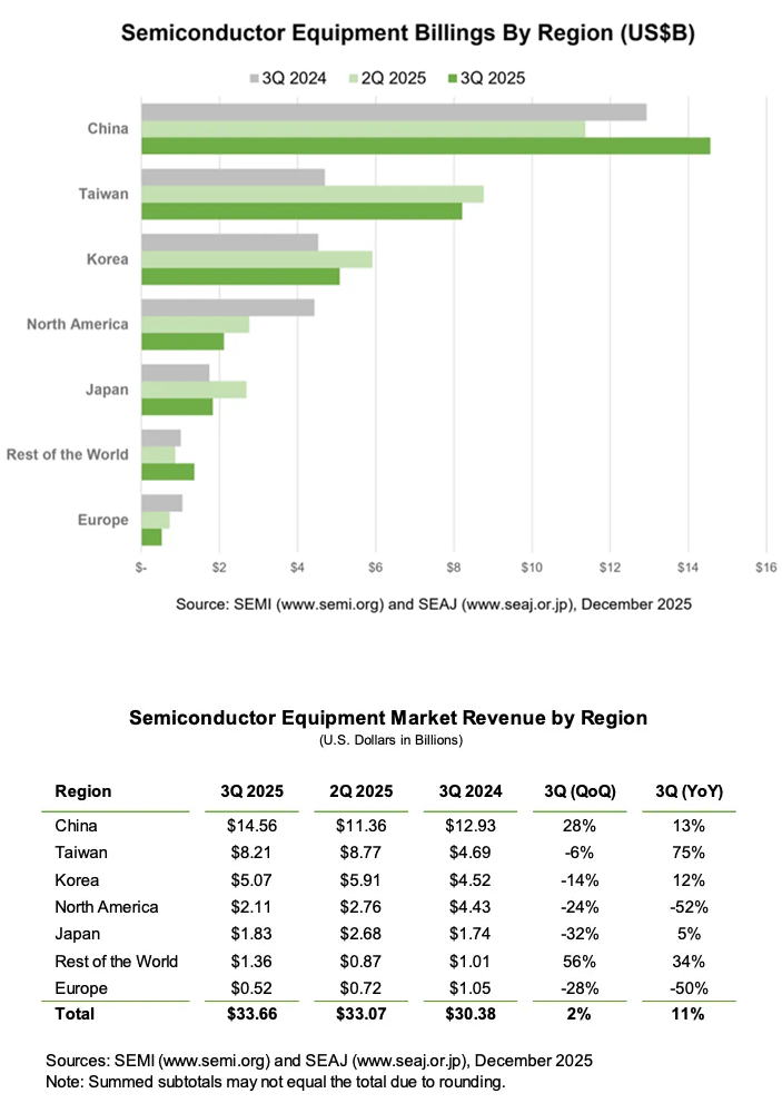 | 2025年第3四半期の世界半導体製造装置販売額は前年同期比11%増 |